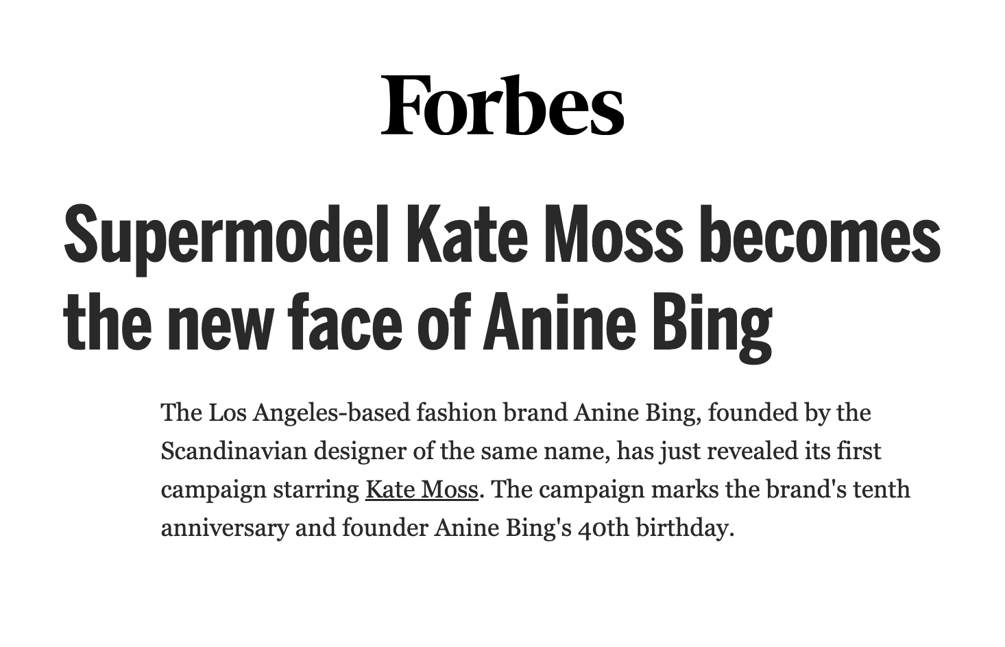 Creative Lead for Anine Bing’s 2023 360º Global Marketing Campaign: Oversaw the development and execution of a two-part campaign featuring Kate Moss, photographed by Chris Colls. The first phase introduced our Fall collection and revealed Kate Moss as the new face of the brand. The second phase spotlighted the launch of the bestselling Kate Bag, with a London-centric campaign and exclusive event.